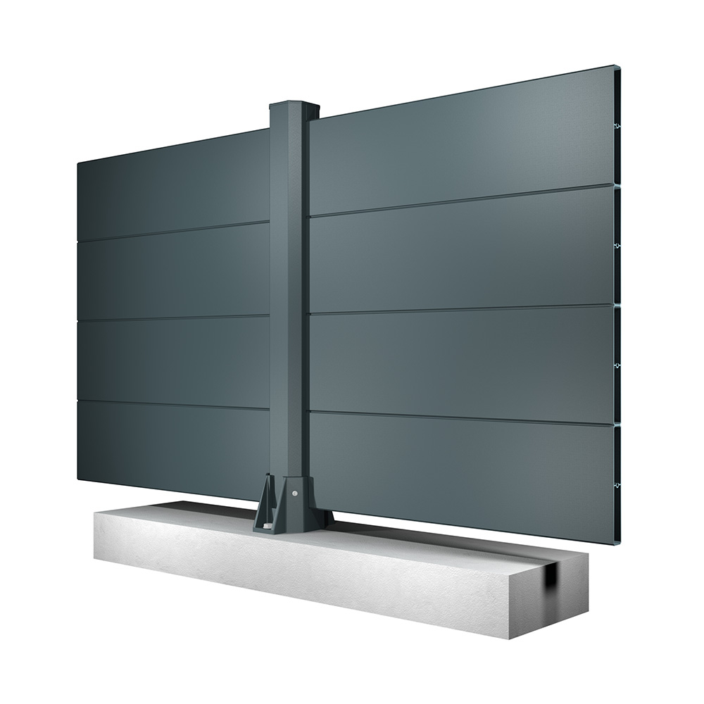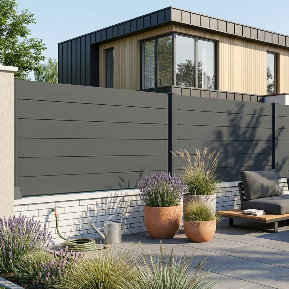 Son design moderne et épuré s’intègre harmonieusement à tous types d’environnements, qu’il s’agisse d’une habitation contemporaine ou d’un aménagement extérieur plus classique. Fabriquée en aluminium thermolaqué, cette clôture aluminium pleine offre une excellente résistance aux intempéries et conserve durablement son aspect esthétique.