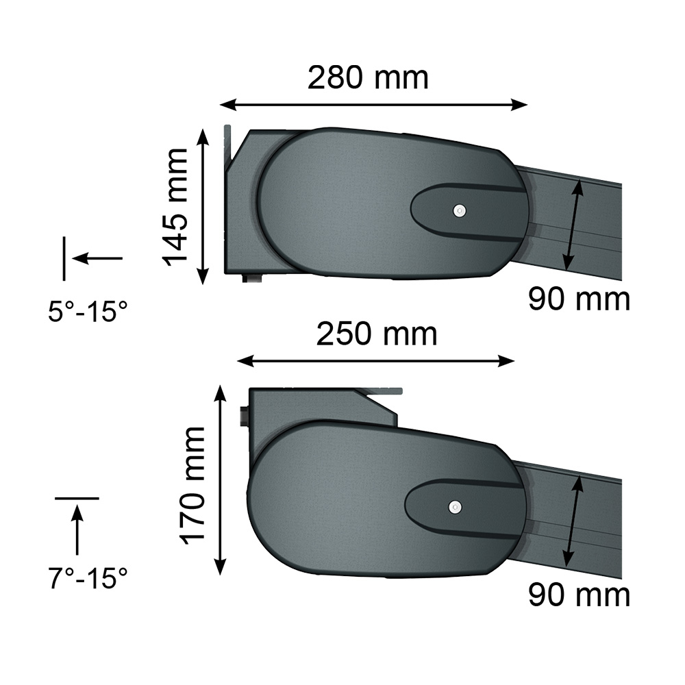Encombrement du coffre Pose façade : H 145 x P 280 mm | Pose plafond : H 170 x P 250 mm