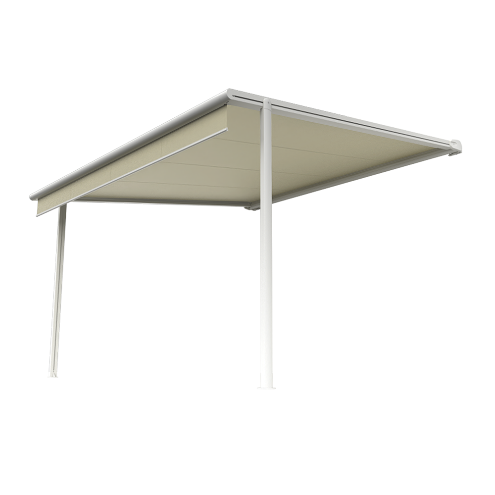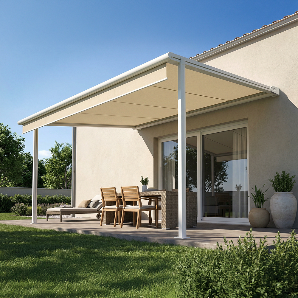 Les poteaux peuvent être positionnés à l'extrémité ou être déportés jusqu'à 1.00 m maximum de l'avancée totale, ce qui assure une adaptation optimale à votre espace extérieur.