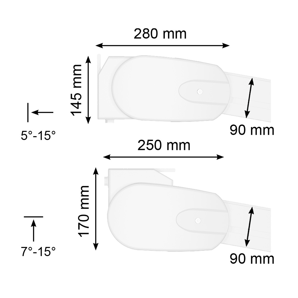| Encombrement du coffre | Pose façade : H 145 x P 280 mm | Pose plafond : H 170 x P 250 mm |
