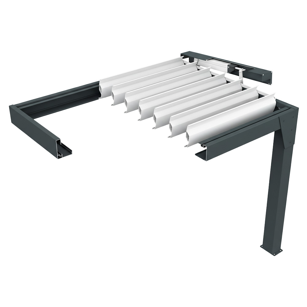 Ses profilés et ses lames entièrement en aluminium garantissent une structure solide et robuste. Pour votre plus grand confort, l'orientation des lames vous permet de maitriser l'ensoleillement et la température et d'avoir une terrasse naturellement ventilée. Motorisation par vérin électrique pour une ouverture des lames facile et silencieuse.