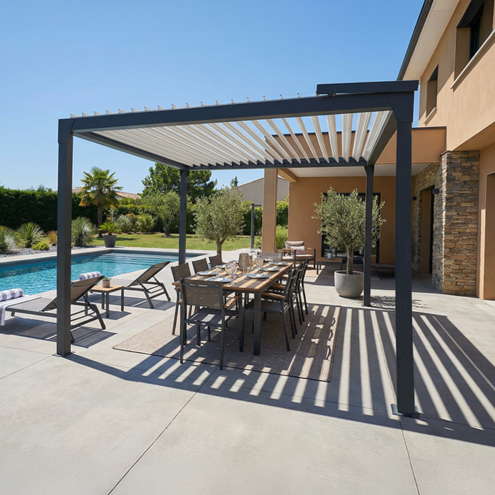 Pergola à lames orientables au design élégant et aux lignes épurées qui s'intègre parfaitement à une architecture à la fois contemporaine ou traditionnelle.