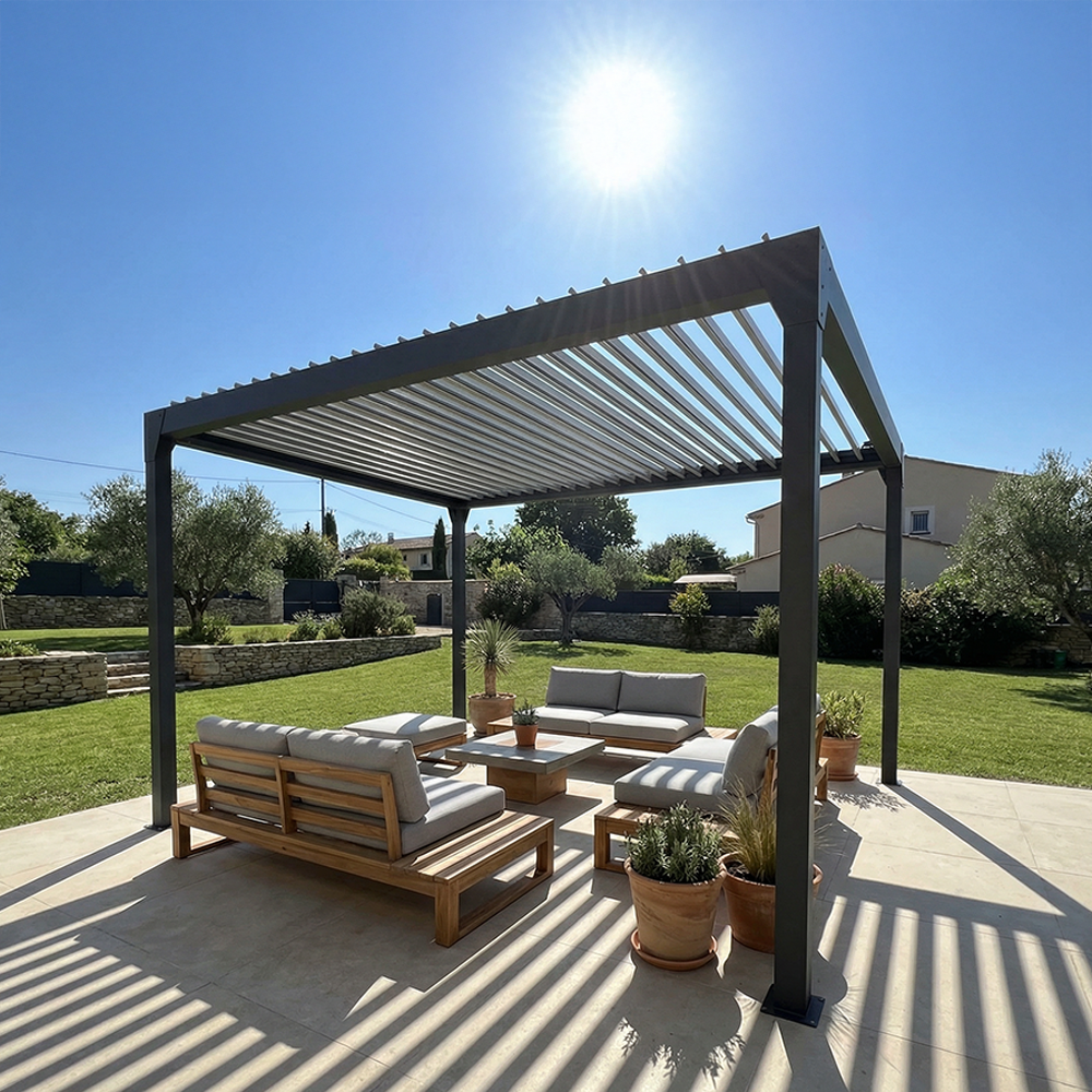 La pergola bioclimatique îlot BERYL à 4 poteaux est la solution idéale pour profiter de votre extérieur et partager des moments de convivialité sur votre terrasse.