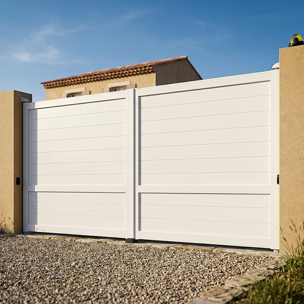 Le portail double battant s’ouvre vers l’intérieur, c’est un portail poussant. Cela permet de ne pas dépasser sur la voie publique quand vous ouvrez votre portail. Avec sa télécommande, il est très pratique de l’ouvrir quand vous arrivez chez vous.