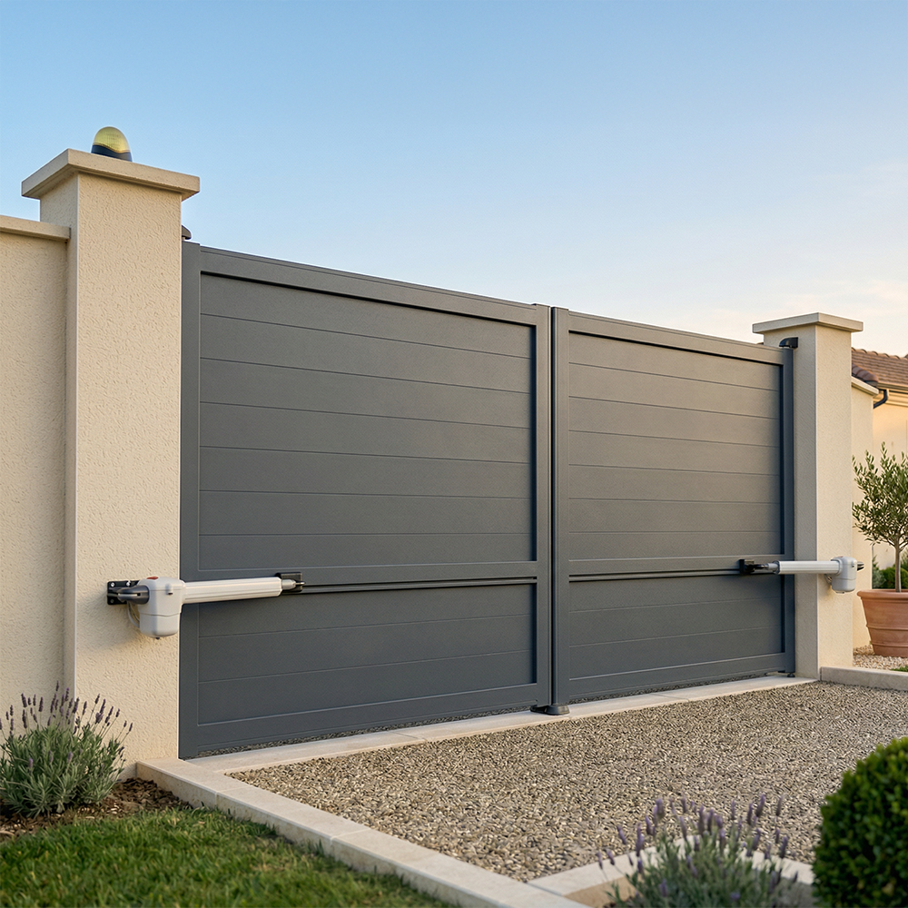 Le portail double battant s’ouvre vers l’intérieur, c’est un portail poussant. Cela permet de ne pas dépasser sur la voie publique quand vous ouvrez votre portail. Avec sa télécommande, il est très pratique de l’ouvrir quand vous arrivez chez vous.