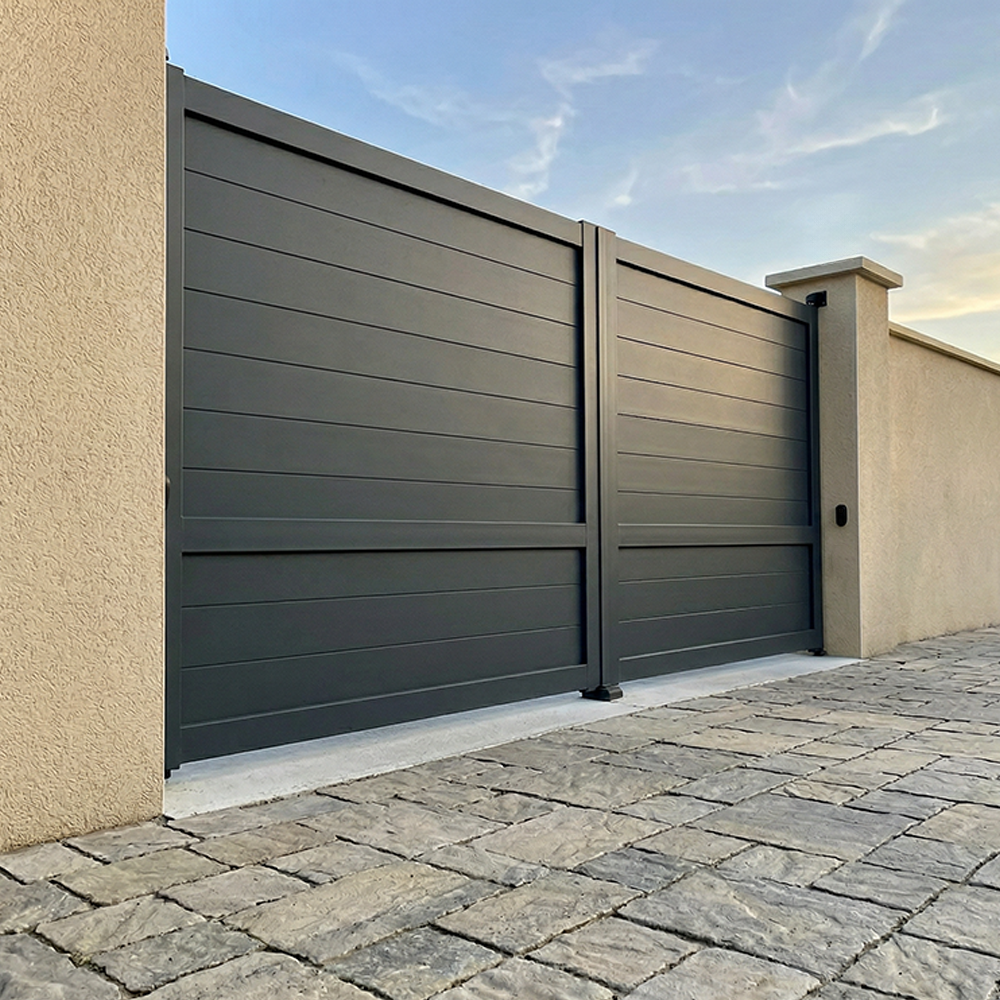 Le portail double battant à panneau plein dispose de lames de 155 x 20 mm qui s'emboîtent ensemble pour donner un aspect lisse et plein au portail, offrant non seulement un design élégant, mais aussi une intimité totale en bloquant toute vue extérieure. Le portail est conçu pour un montage facile et rapide, les lames s’insèrent directement dans la structure sans mesure ni crochet, il suffit de les aligner les unes avec les autres pour créer la hauteur.