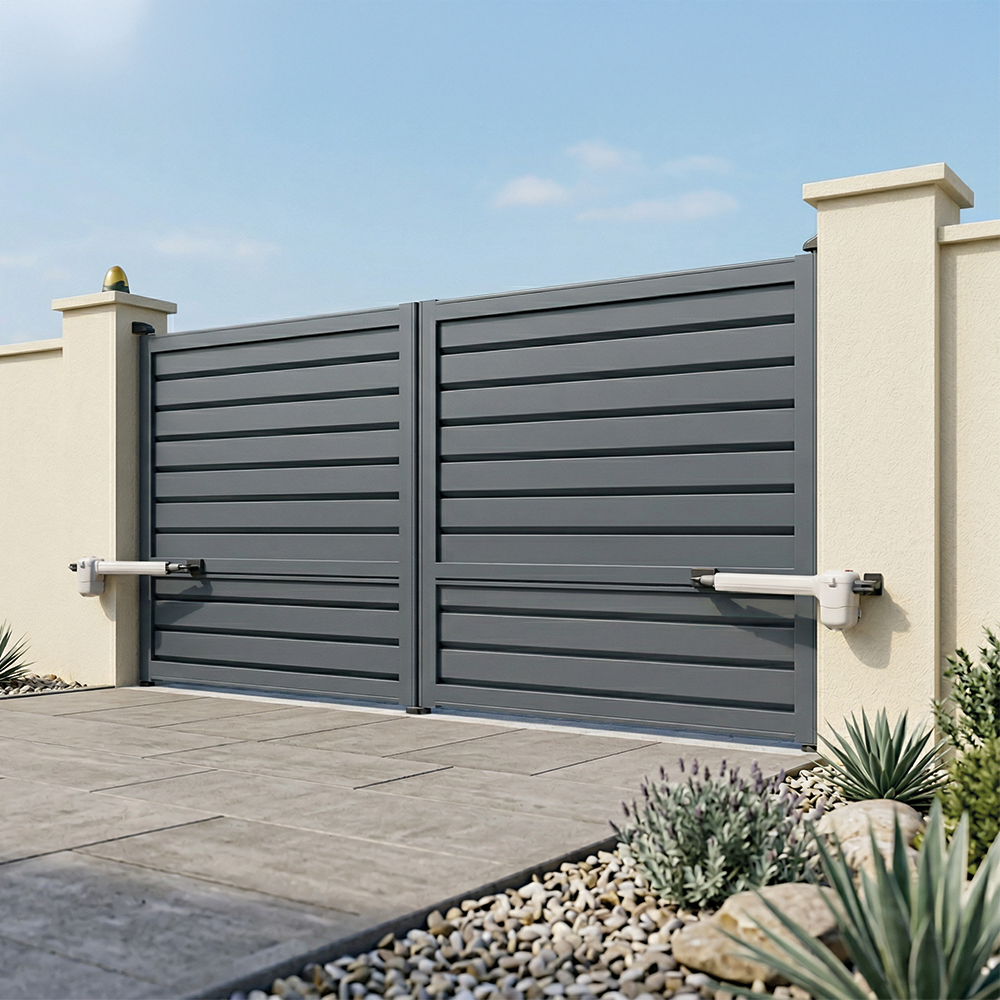 Portail double battant motorisé à panneau brise-vue/persienné