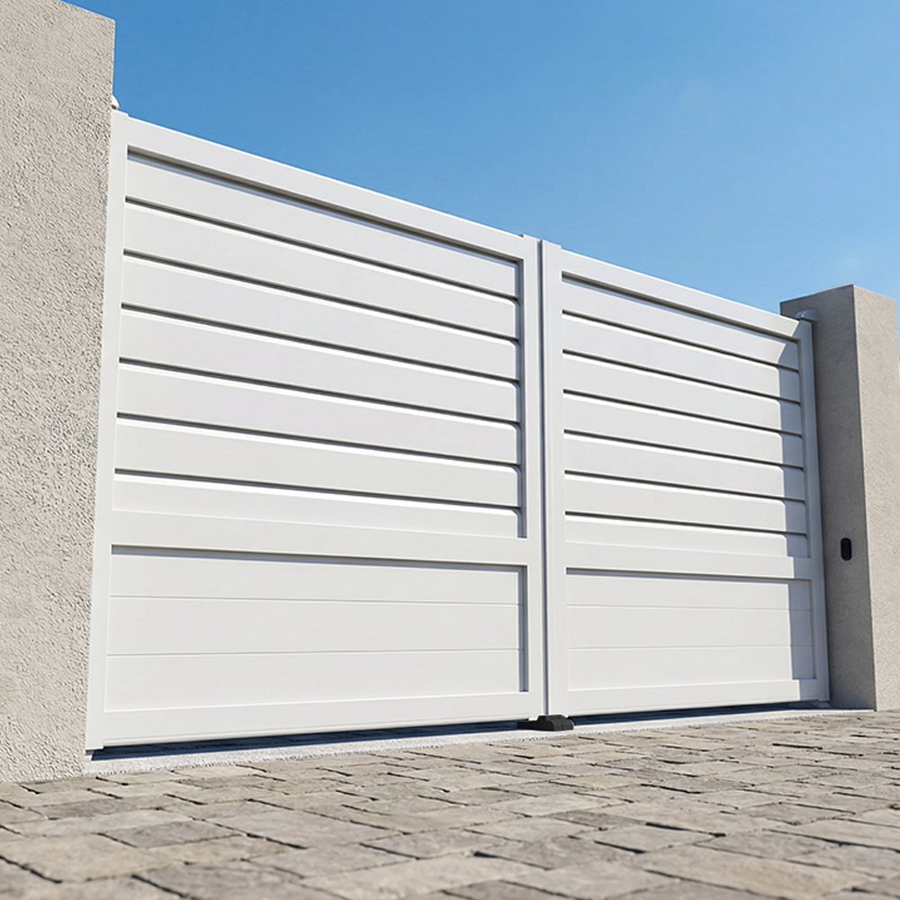 Le portail double battant à panneau mixte dispose de lames de 155 x 20 mm qui s'emboîtent ensemble pour donner un aspect lisse et plein au portail sur la partie basse, et des lames biseautées de 149 x 20 mm s'imbriquent pour donner un aspect brise-vue sur la partie haute. En combinant ces deux aspects, vous pourrez profiter pleinement de votre espace extérieur de manière paisible et stylée. Le portail est conçu pour un montage facile et rapide, les lames s’insèrent directement dans la structure sans mesure ni crochet, il suffit de les aligner les unes avec les autres pour créer la hauteur.