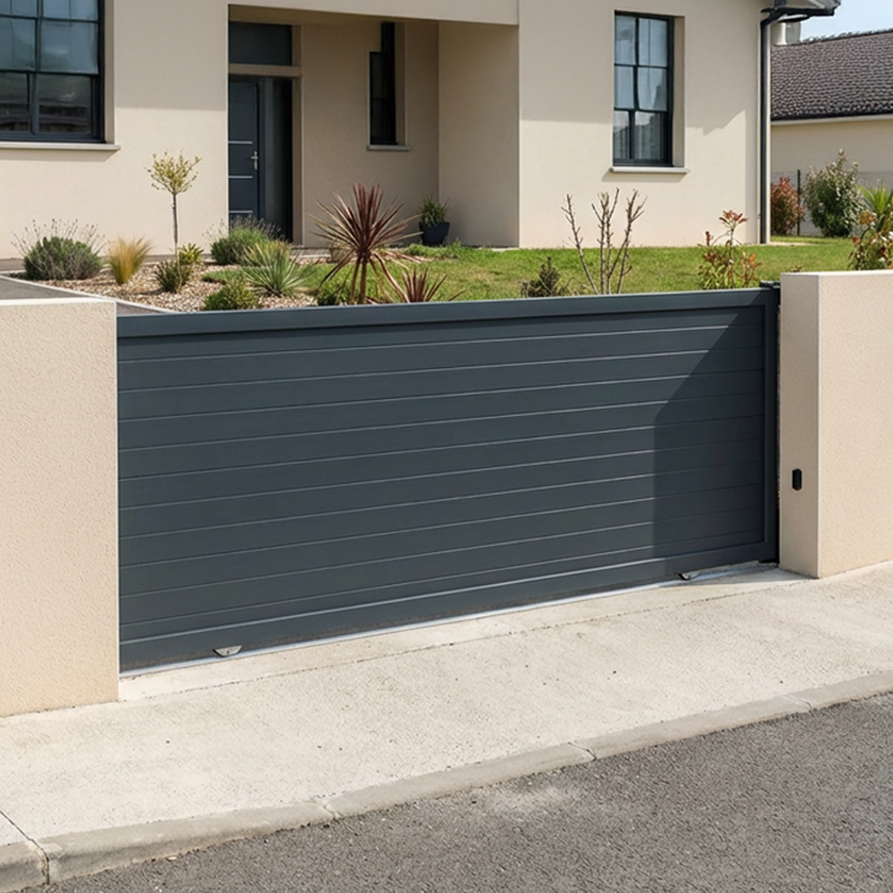 Le portail coulissant motorisé à panneau plein Intersun combine à la fois praticité et élégance. Fabriqué en aluminium extrudé thermolaqué, il est résistant dans le temps et offre un design contemporain qui s'intègre parfaitement dans toutes les architectures. Livré en kit complet avec tous les éléments nécessaires au confort et à la sécurité lors de son utilisation.
