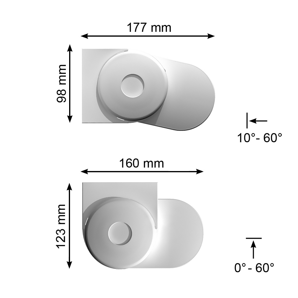 - Inclinaison min/max (réglage par vis) : Pose façade : 0° à 60° | Pose plafond : 10° à 60°