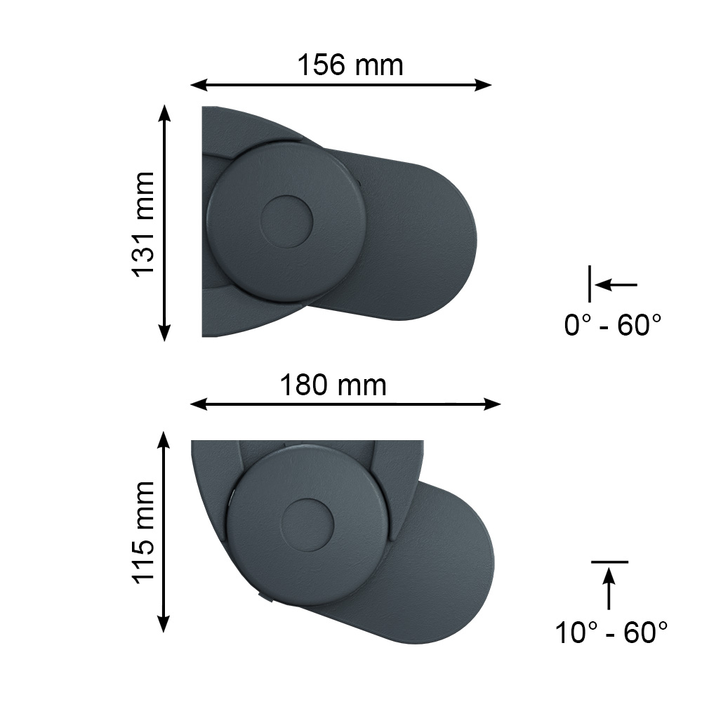 • Inclinaison min/max (réglage par vis) : Pose façade : 0° à 60° | Pose plafond : 10° à 60°