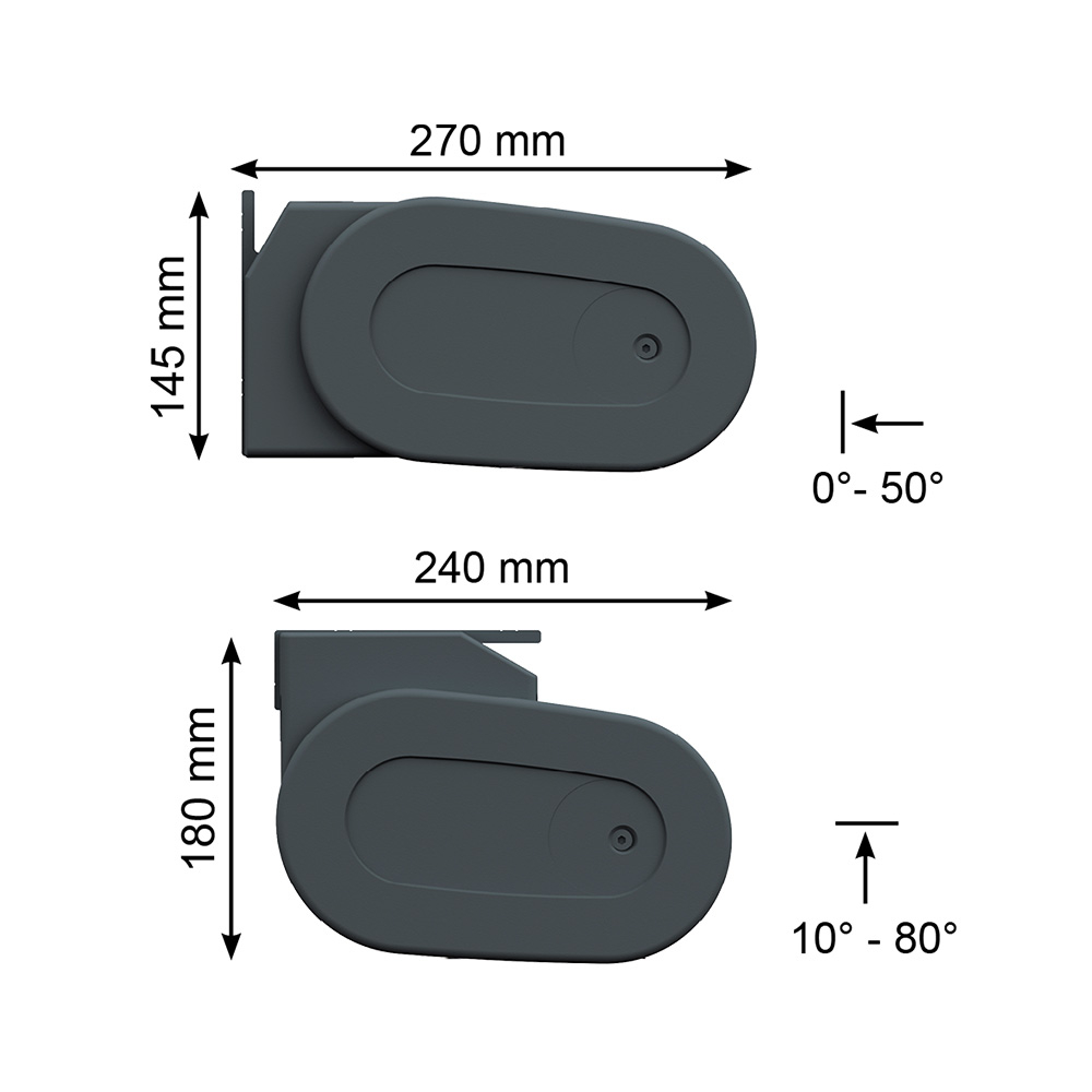 • Inclinaison min/max (réglage par vis) : Pose façade : 0° à 50° | Pose plafond : 10° à 80°