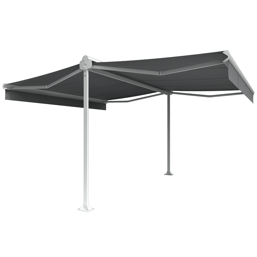 Le store banne double pente ENARGITE sur pied avec coffre vous offre une très grande surface de protection solaire. Il permet de réaliser des ombrages jusqu'à 36m². Sa structure autoportante 100% aluminium est dotée de 2 poteaux et de 2 supports à fixer au sol. Doté de 4 bras articulés, le store permet une ouverture symétrique de la toile et garantit une bonne stabilité avec une toile tendue. Son coffre assure une protection parfaite de la toile et de tout le mécanisme d'enroulement. Disponible en mode manuel à treuil mais également motorisé. Grâce à ses lignes épurées et son design esthétique, le store banne double pente ENARGITE habillera parfaitement votre terrasse.