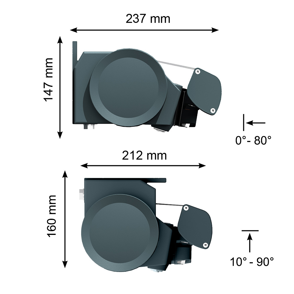 • Inclinaison min/max (réglage par vis) : Pose façade : 0° à 80° | Pose plafond : 10° à 90°