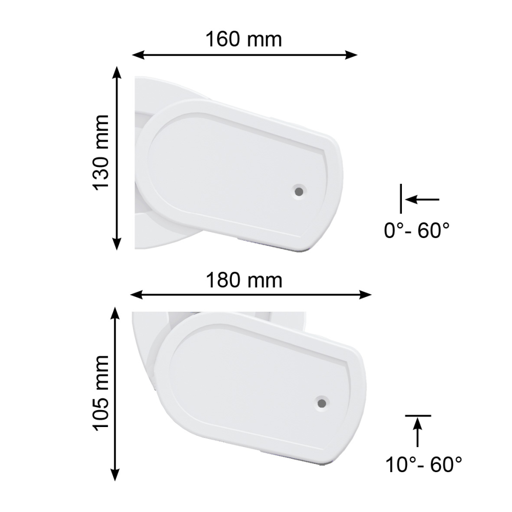 • Inclinaison min/max (réglage par vis) : Pose façade : 0° à 60° | Pose plafond : 10° à 60°
